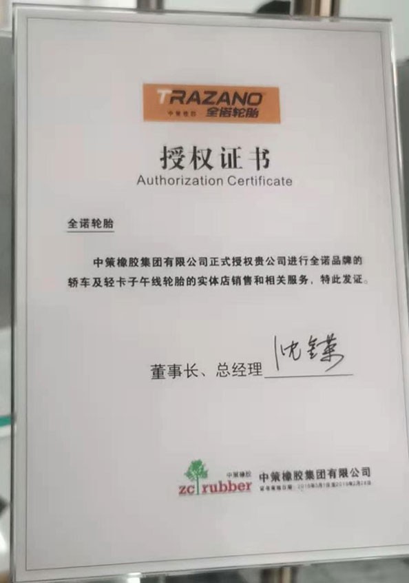 证书编号: 1017 证书名称: 授权证书 发证机构: 中策橡胶集团 生效日期: 2021年01月19日 截止日期: 2031年01月19日 认证简介: 中策橡胶集团有限公司授权全诺轮胎销售